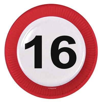 Eetbordjes 16 Jaar Stopbord. ca 23 cm diameter in doorsnede. Per 8 Stuks.