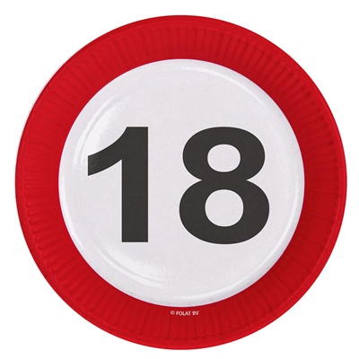 Eetbordjes 18 Jaar Stopbord. ca 23 cm diameter in doorsnede. Per 8 Stuks.