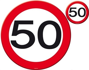 Placemat set met onderzetters 50 jaar. Deze set bestaat uit 4 verkeersbord placemats en 4 onderzetters.