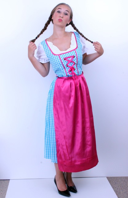Tiroolse Jurk Lang Anna. Blauw Wit Geruit. Schort Pink. Deze Tiroler Jurk is verkrijgbaar in diverse maten.